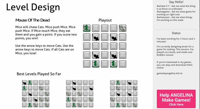 I’ve been working on a new version of ANGELINA on and off for just over a year now. Back in July I wrote about my plan to build a new kind of automated game designer, different to how ANGELINA has worked in the past. Past ANGELINA was like a big machine with a button on saying “MAKE GAME” and I pressed it whenever I wanted a game. But the new ANGELINA is more independent: it has a catalogue of things it’s working on; a memory of what it’s done in the past; and soon it’ll be able to do things other than just make games, too. This new version of ANGELINA will play other people’s games, and discover new design knowledge that it can use in its work. It can run 24/7 without being told when to do things – it’s more in charge of its own fate than ever before. I gave a little talk about the past and future of ANGELINA last November, which you can watch online here.
